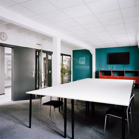 La cloison qui séparait les deux petites salles a été abattue pour permettre de réunir tout le personnel autour d’un îlot de tables, soit une vingtaine de collaborateurs. Le peintre a peint ton sur ton le logo de la FRC sur un mur de couleur. Un meuble de rangements USM rouge a été installé sous l’écran pour créer un décor plus vivant. Il sert aussi à ranger toute la technique.